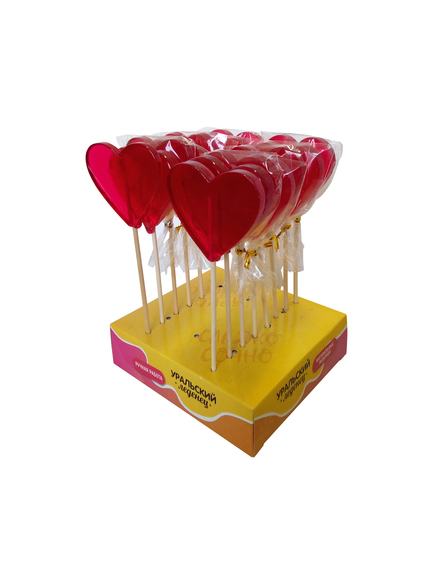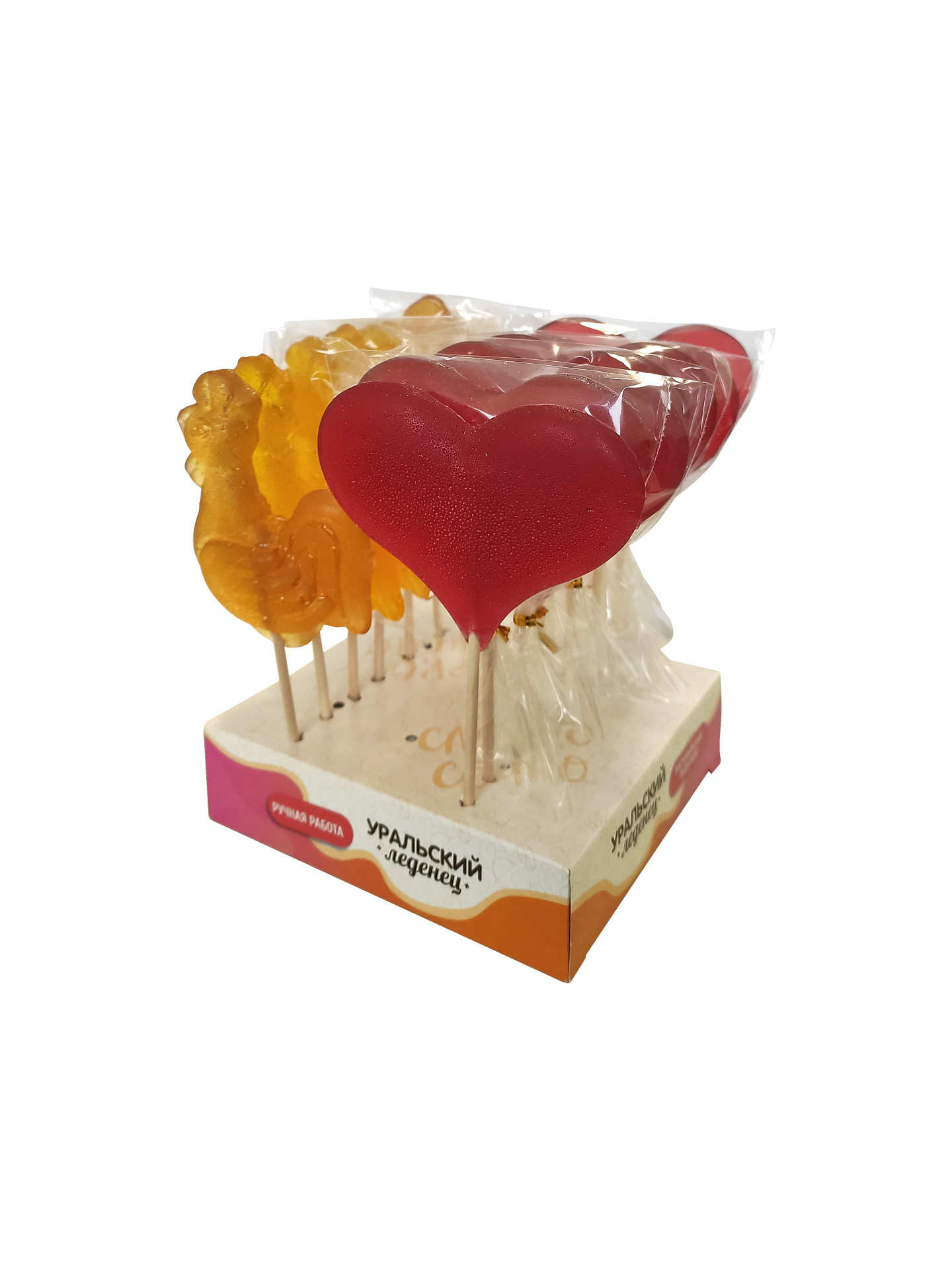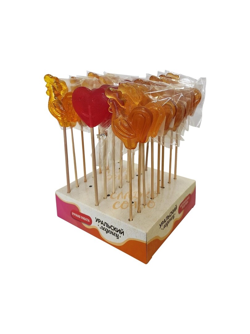 Параметры конфеты: Вес 24 гр. - петушок, 18 гр. - сердечко. В шоу боксе 16 петушков и 8 сердечек. Палочка деревянная: длина 10 см, ширина 3 мм. Леденец упакован в индивидуальный полиэтиленовый пакетик.