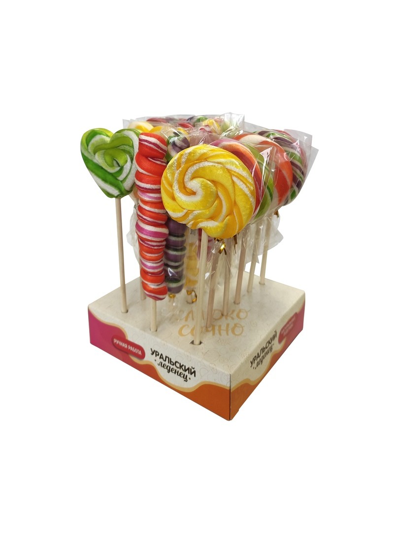 Параметры конфеты: Вес 50 гр. Высота 9 см, ширина 5 см. Палочка деревянная: длина 8 см, ширина 3 мм. Леденец упакован в индивидуальный полиэтиленовый пакетик.